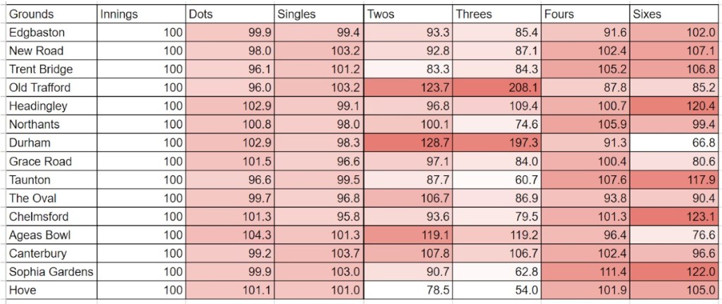 This produced the table seen above. The table is presented as index numbers, with 100 representing the mean number of each scoring type and differences from 100 showing the percentage change between locations. Some quite clear observations can instantly be drawn from the chart. All grounds have very similar numbers of dots and singles scored on them, with fluctuations of not even 5% from the mean above or below. Threes have the greatest fluctuations as a result of having the smallest sample size, but even so have to be included as grounds with long boundaries inherently have more threes scored. Finally as assumed, the amount of sixes also has great fluctuations due to boundary length. Also with the number of sixes scored in t20 tournaments rising significantly in the 10 year time period, these discrepancies may grow as some grounds move boundaries inwards in order to boost attendance.