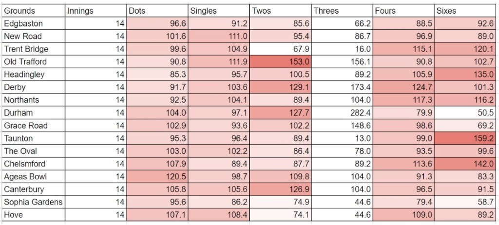 Ball tracking would be the most effective way to compare the outcome of each ball in order to create standardised results for each shot played. It would allow for sixes to be worth their true value on each ground and estimates to be drawn on whether twos would turn to fours or fours be able to be stopped before the boundary. It would also account for differences in field settings which are forced due to different distances needing to be covered to stop a boundary. However, as I lacked the data of every ball which has been tracked in a 3D plane in the last ten years I sought to follow the next best (and much easier approach) of comparing the number of ones, twos, threes etc. scored on each ground in order to compile a chart showing how these numbers compared to the league average over the last ten years.