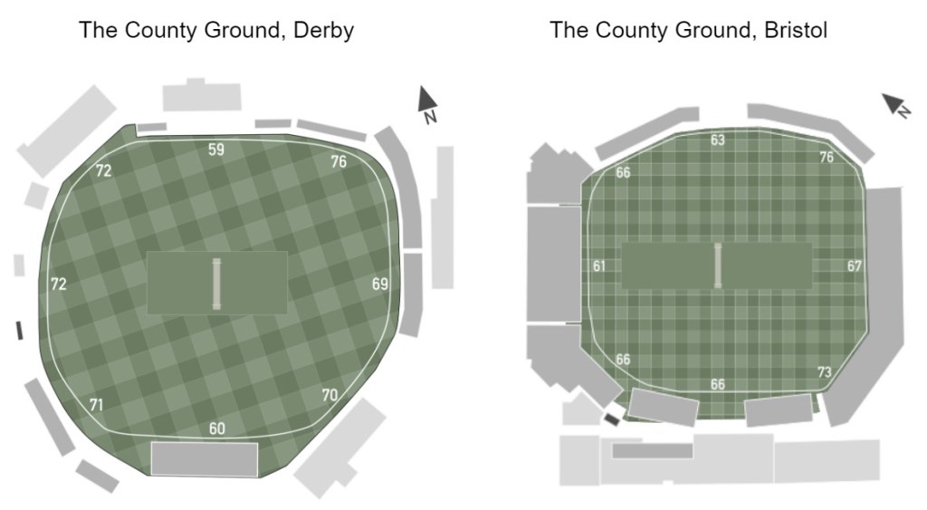 However much I would like to say the problems with the model are limited to distances of sixes and preparations of wickets not being accounted for, it would be a stone cold lie. ‘Ask Cricinfo’ (Cricinfo’s AI search engine which I used to collate data, as it responds to accurate prompts in a way no other service does) had problems with trying to process what I meant by ‘The County Ground, Derby’, meaning that Derbyshire is excluded from the statistics over the last ten years. As seen later, where I provide examples of some adjusted run totals, I took scores at Derbyshire at face value and provided all the runs scored to the players final total. This was an ample solution for the players who only played one game out the county ground, but for both Shan Masood and Wayne Madsen who scored the fifth and ninth most runs in the blast respectively, I had to leave them out of the adjusted scores. With Derby having the shortest straight boundaries in county cricket at 60m and 59m this seemed fairly reasonable. The south group also didn’t escape the issue, with the County Ground Bristol also lacking stats. When comparing these grounds they do have some similarities with short straight boundaries and longest in the Cow Corner region. The main difference is the 61m boundary square of the wicket found in Bristol. Even so, I took the same solution with both grounds and was fortunate enough to not have any Gloucestershire players in the top ten run scorers.