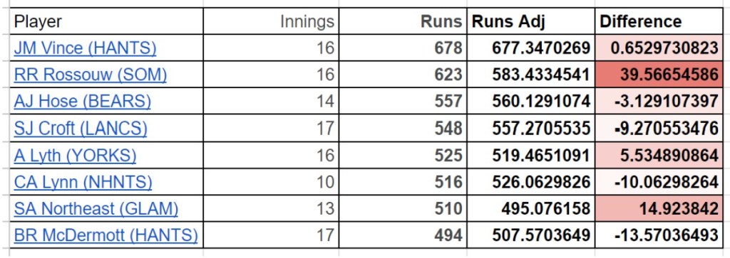Therefore, even though Roussow had a very productive season which saw him score the second most runs in the season even when adjusted, it arguably isn’t as close to James Vince as once thought, who gained very little extra run value when he was playing. Roussow saw 32 of his 40 runs gained from his play at Taunton alone, whereas Vince was seen to be robbed of 10 runs as a result of playing at the Ageas Bowl. The main way Roussow was seen to be gaining runs at home was in the number of sixes he hit, which were adjusted from 29 to 24.5. Only by using ball tracking data would you be able to tell if this was an accurate adjustment, as if you ask anyone who was watching Roussow bat, he wasn’t only just about clearing the short Taunton boundaries.