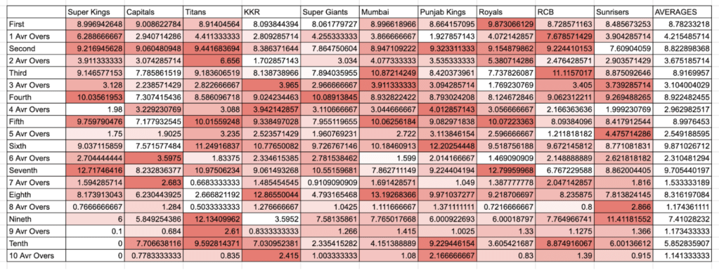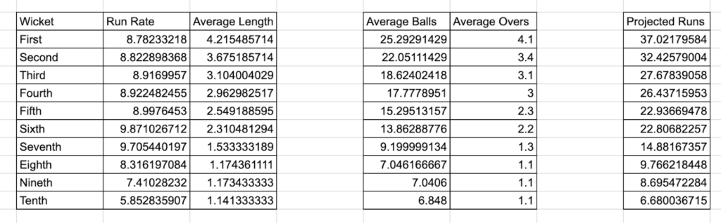 By logging every partnership for every wicket by every team in the IPL for the year, I was able to calculate the average run rate and length of partnership for each wicket, both for every team and for the league as a whole. This allowed for a revised set of projected scores, where each team then batted as an average team for the remainder of their innings, with wickets falling at the average length and the teams scoring at the average run rates per wicket. I did this both with the league average and for the average of the team itself to create the three options. (The chart shows each team’s run rates for each wicket, marked as First, Second etc. then the alternating rows are the average length of each partnership of each wicket).